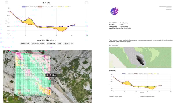 La piattaforma permette di generare automaticamente sezioni del terreno e calcolare i volumi di sterro e riporto tra modelli digitali, fornendo report dettagliati con mappe, grafici e dati metrici. È possibile confrontare rilievi successivi per valutare l’avanzamento dei lavori, monitorare trasformazioni del territorio e supportare la direzione lavori con strumenti chiari, precisi e sempre accessibili online.